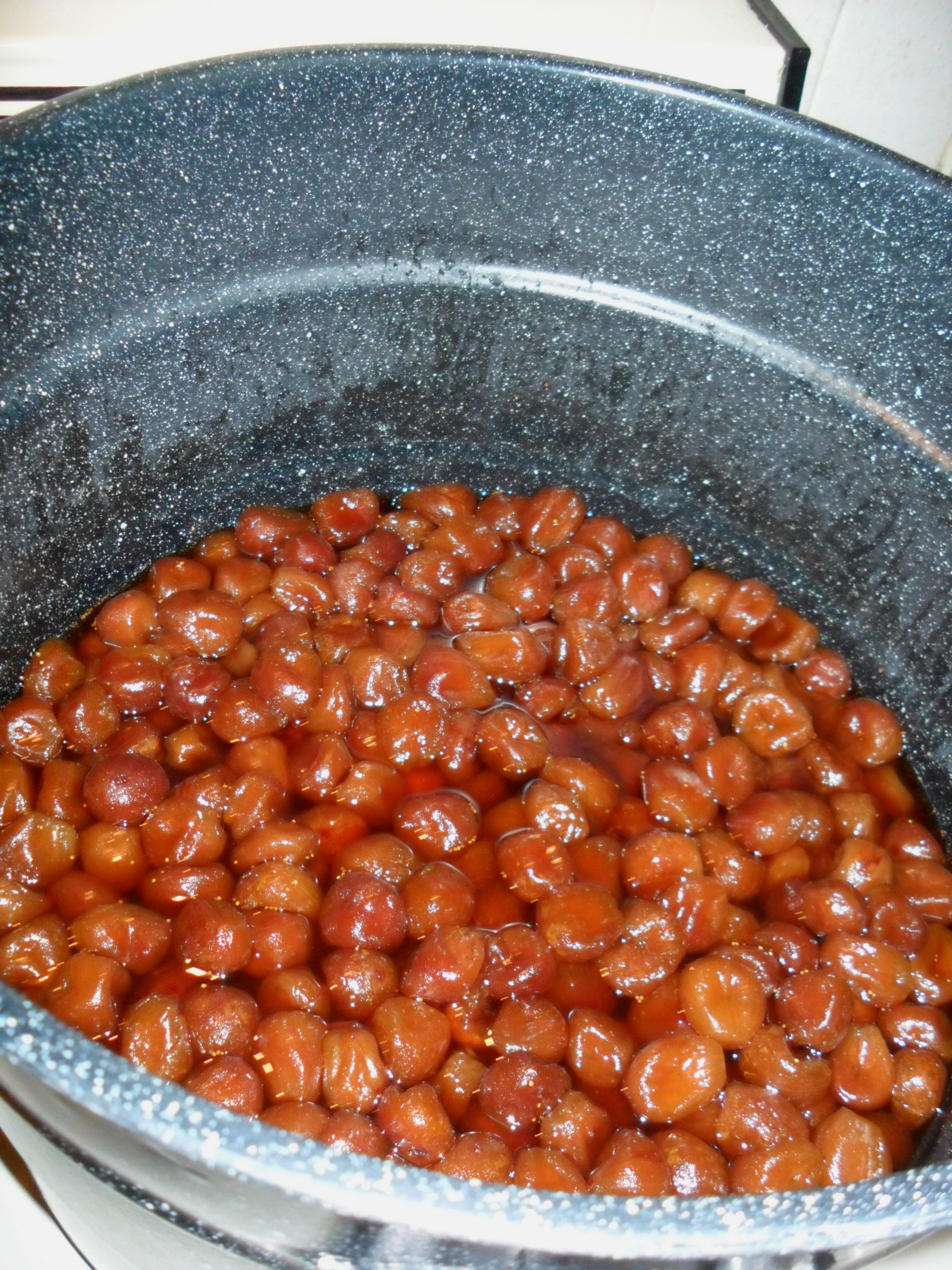 Mama and Daddy get a half gallon every day from their tree. I offered to preserve the figs for the family this year, so I have about four gallons of figs right now that Daddy picked and saved. Since I don’t personally have a fig tree, I get all excited when their tree bears. I love canning anything. Tomato Relish, Jelly and Syrup from fruit of the land, Fig Preserves, and the list goes on. Last night I was up late actually enjoying cutting the stem ends off the figs, dropping them into the pot, and pouring the sugar over them by layers. As I got about a gallon of figs in a layer into the pot, I poured about a cup – a cup and a half of sugar over them. I did this about four times, put the lid on the pot, and set the pot on the table for overnight. The sugar draws the juice out of the figs, and when they are cooked down slowly, they have plenty of syrup to cover them. I have a recipe, but I don’t go strictly by it. I process fig preserves the way Mamaw showed me how she did it when I was a young girl, and how my Mama does hers.