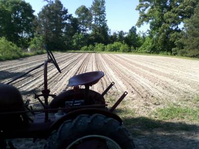 We’ve had some laughs when “droppin’ taters.” The pieces of potato are from potatoes that have eyes that have sprouted. The potatoes can be cut into several pieces as long as each piece has at least one sprouted eye. Daddy opens up the rows with one plow under the tractor belly and.I go behind him and drop each piece about 8″ or 10″ apart. Then Daddy will knock that plow over a little so he can add another plow. These two plow heads will be on each side of the row and will turn the soil over the potato pieces and cover them as he plows down each row again.